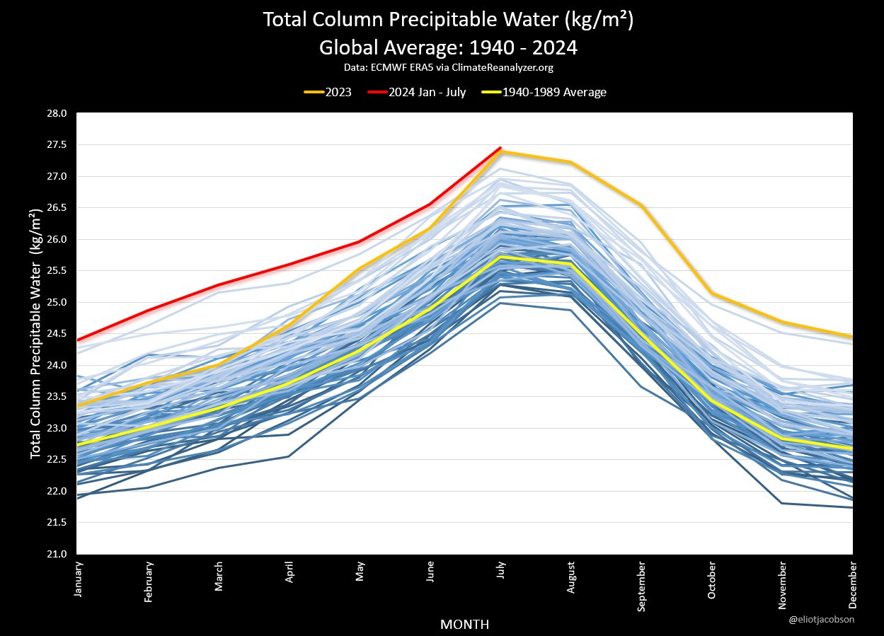 Eine repräsentative Messgröße dafür ist der sogenannte PWAT (Precipitable Water), er steht für den Wassergehalt der Luftsäule zu einem bestimmten Zeitpunkt an einem bestimmten Ort, hier im globalen Mittel. Der langjährige Schnitt für Juli lag bei 25,7mm, 2023 waren es 27,3mm und heuer sind wir schon knapp drüber.