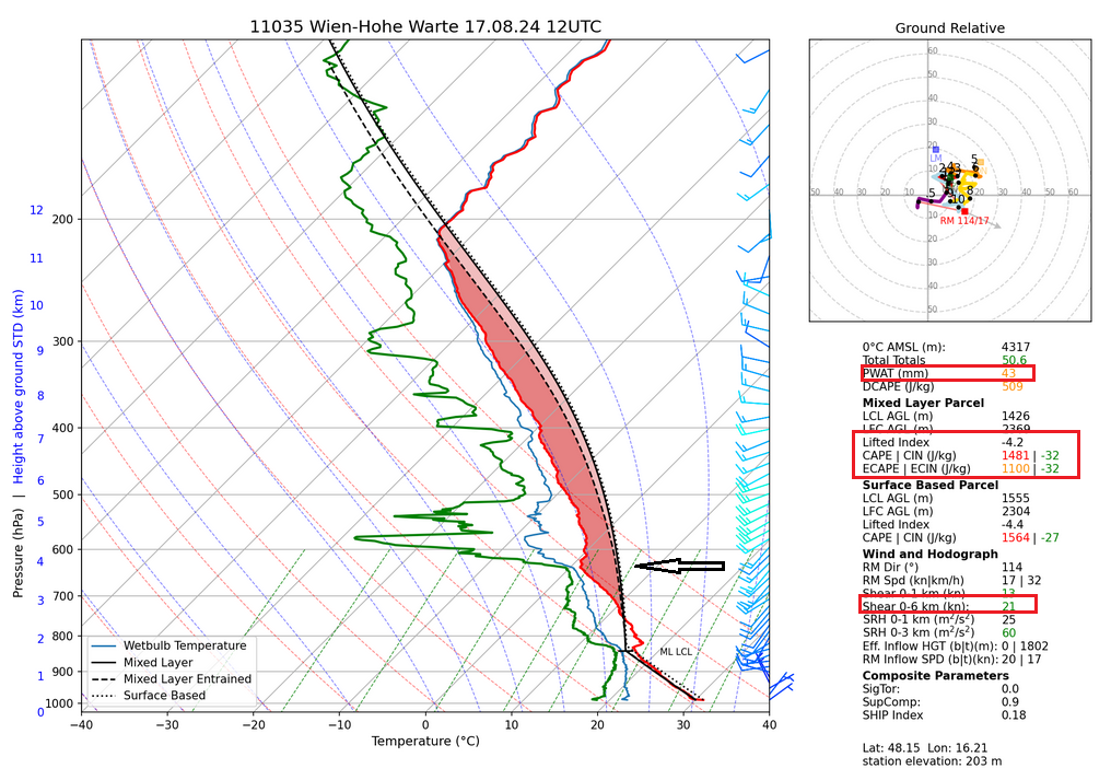 Der zeitnahe Aufstieg von Wien zeigt einen PWAT von 43mm, auch für die regionale Klimatologie (ca. 25-30mm im August) ein weit überdurchschnittlicher Wert. Die Labilitätsenergie war hoch, aber mit rund 1100-1500 J/kg nicht extrem. Der Lifted Index von -4 deutete auf „fat CAPE“ hin, was größeren Hagel grundsätzlich fördert. Die Nullgradgrenze lag jedoch mit 4000m ziemlich hoch, sodass viel Hagel abgeschmolzen ist, bis er den Boden erreicht hat. Aufgrund der trockenen Luftschichten unterhalb der Nullgradgrenze wirkte aber auch Verdunstungskälte und verzögerte das Abtauen. Das erklärt letztendlich, weshalb trotz der hohen Nullgradgrenze bis zu 3cm große Hagelkörner aufgetreten sind. Die Windscherung war allgemein schwach ausgeprägt, aber mit 20kt (0-6km) nicht vernachlässigbar. Die steuernde Höhenströmung war Südwest, zwar langsam ziehend, aber genug Zuggeschwindigkeit für gewisse Organisation des Gewitters. Die niedrigste, ausgemessene Wolkenobergrenzentemperatur betrug ca. -62°C – das entspricht einer Höhe von rund 12,5 bis 13km der Gewitterwolke.