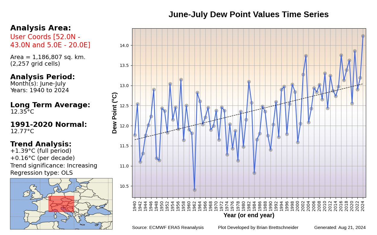 Der Sommer 2024 wird im Alpenraum als der schwülste seit Messbeginn eingehen. Die Taupunkte steigen seit Jahrzehnten kontinuierlich an, wobei 2024 ein neues Rekordjahr markiert. Hohe Taupunkte deuten an, dass die absolute Feuchte der Luftmasse ansteigt, die Starkniederschläge begünstigt.