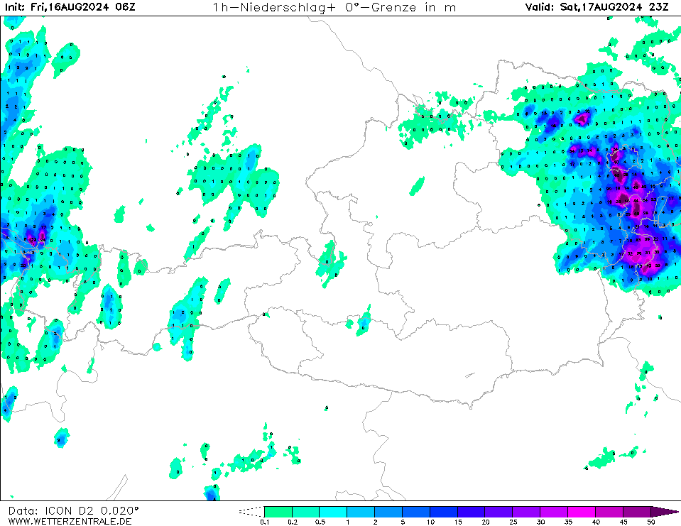 Das deutsche Lokalmodell ICOND2 rechnete am Vortag im 06z-Lauf (Mittagslauf) für Samstagnacht (!) extreme einstündige Regenraten in Ostösterreich: