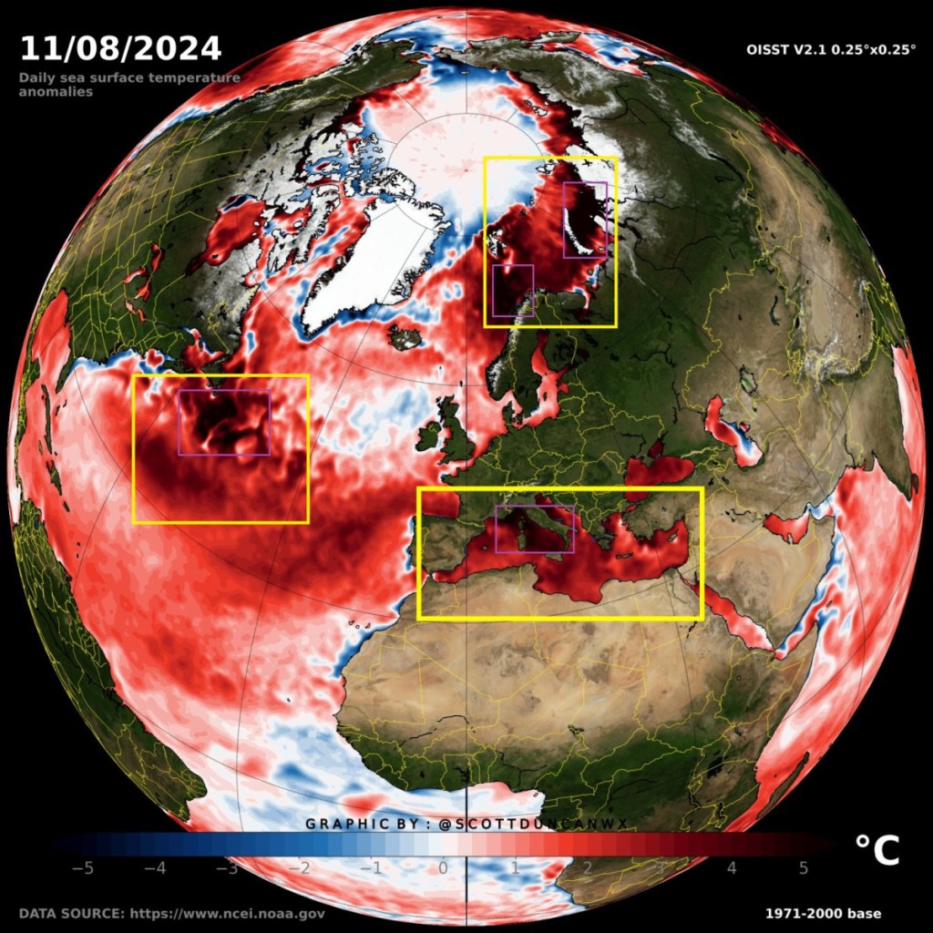Zu warm sind auch weite Teile des Atlantiks sowie des Nordmeeres, was schon mal einen Vorgeschmack auf den kommenden Winter liefert.