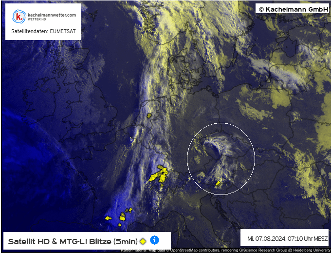 Ein nur in der Höhe ausgeprägter Tiefdruckwirbel über Mitteleuropa, umgeben von wolkenlosem Himmel unter Hochdruckeinfluss. Über Unterkärnten sorgte das Tief für ein Morgenwitter, Satellitenbildquelle: kachelmannwetter.com