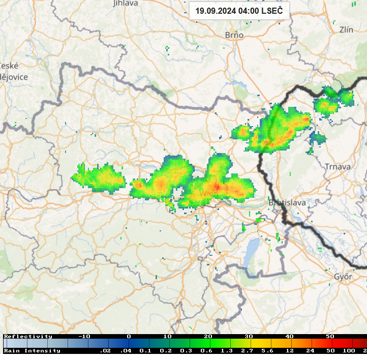 Schauer und Gewitter am Donnerstag, 19. September 2024, 04 Uhr Lokalzeit (slowakisches Radar)