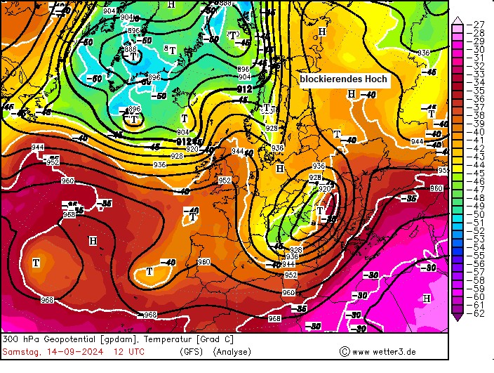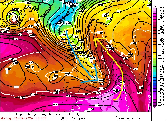 300 hPa + Temperatur, Montag, 09.09.24, 18 UTC (Analyse – wetter3)
