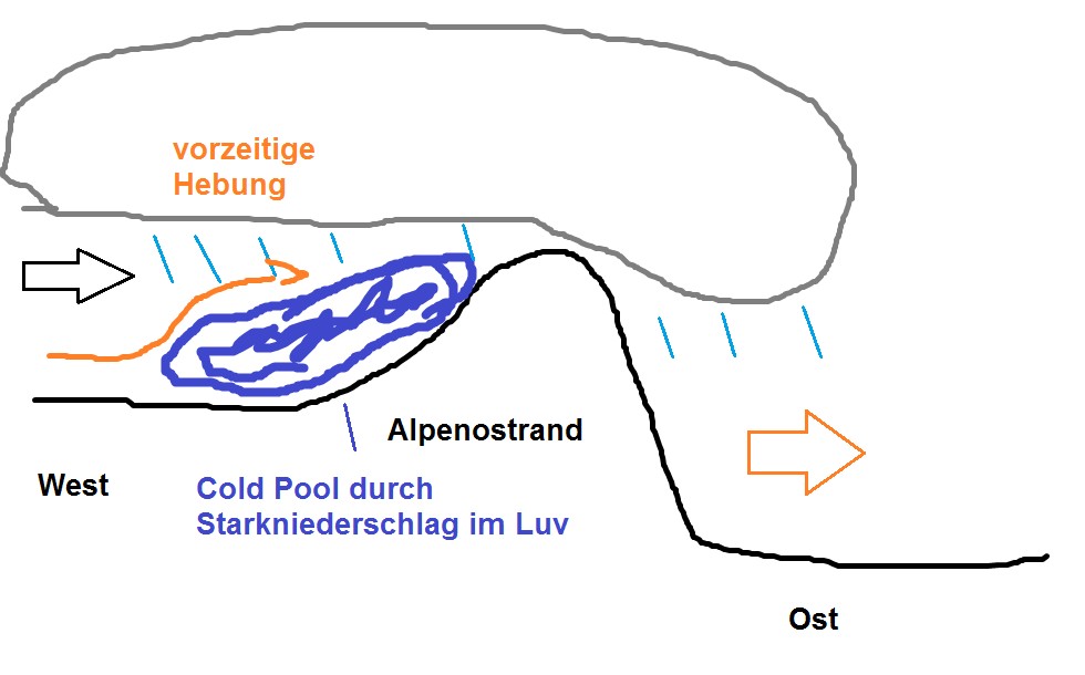 Ein weiterer Effekt, der zum Tragen kommen kann, ist die Cold Pool Bildung im Luv durch Starkniederschlag und isothermer Niederschlagskühlung. Die liegen bleibende Kaltluft fungiert als „virtuelle Topographie“ und das Aufgleiten der wärmeren Luft beginnt vor dem Anstieg der realen Topographie. So kann es auch in niederen Regionen starke Niederschläge geben.