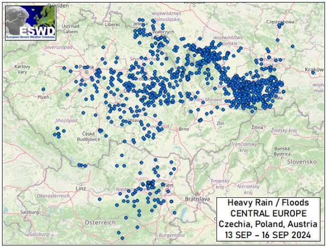 ESWD.eu – Meldungen mit Starkregen mit Überflutungen von Freitag bis Montag