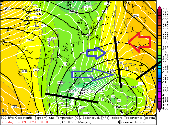 500 hPa relTop, Bodendruck, 500 hPa Geopot + Temperatur am Samstag, 14.09.24, 00 UTC