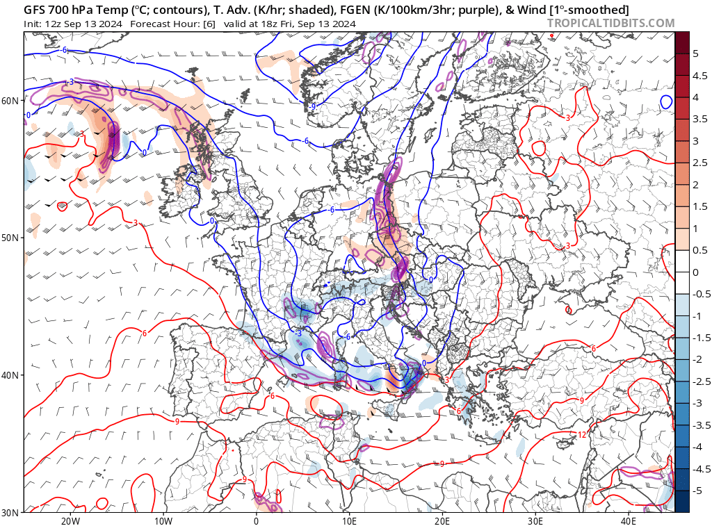 Temperaturadvektion und 700 hPa Temperatur (Linien) am Freitagabend, 13.09.24 (Quelle: Tropical Tidbits.com)