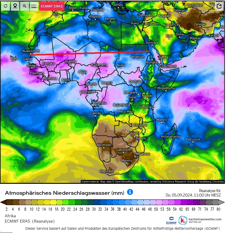 EZMWF ERA5 PWAT für Nordafrika am Donnerstag, 05.09.24 – rot skizziert die klimatologische Südgrenze der Sahara (Quelle: Kachelmannwetter)
