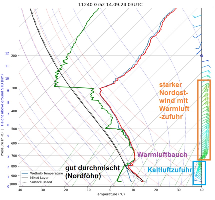 Der Aufstieg von Graz am Samstagmorgen zeigt die föhnbedingt durchmischte Grenzschicht bis 2km Höhe. Darüber nahm die Temperatur zu und der Wind drehte scharf auf Nordost. Er führte feuchtwärmere Luft heran. In die Föhnschicht fallender Niederschlag hat die Windböen wahrscheinlich nochmal deutlich verstärkt.