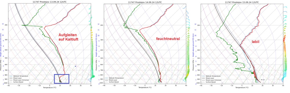 Viele hier beschriebene Faktoren treten auch bei „normalen“ Tiefdrucklagen auf, aber selten in der Kombination. Ohne das kräftige Höhentief wäre ein so starkes Bodentief nicht möglich gewesen. Ohne die blockierenden Hochdruckgebiet keine so starke Gradientverschärfung und Zusammenprall von Luftmassen an einer stationären Front. Ohne den starken Wind ein verringerter Stau und eine schwächere Bodenkonvergenz. Der PWAT in den Aufstiegen von Wien und Prostejov lag während dem Ereignis zwischen 25 und 32mm – für September überdurchschnittliche Werte!