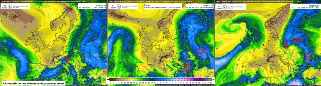 Ich habe mich hier der Vorhersageprodukte von EZWMF bedient, weil die ERA5-Daten noch nicht so weit reichen. Den atmosphärischen Fluss sieht man schön in blau, später abgeschwächt in grün. Daraus wird ersichtlich, dass die Luftmasse am Donnerstag, der erste Tag der Hochwasserkatastrophe direkt von der Adria kam.