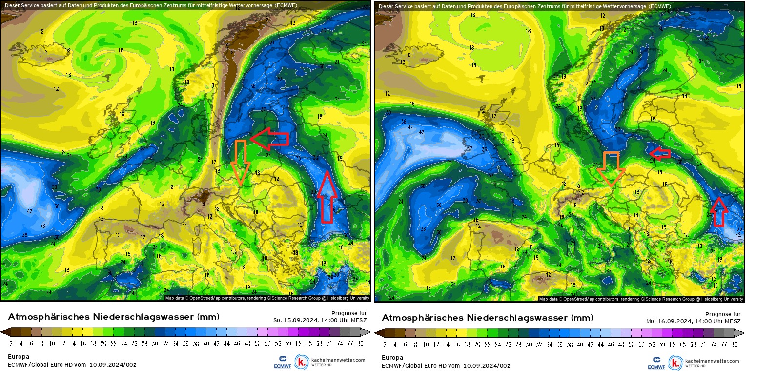 PWAT jeweils mittags am Sonntag, 15.09. und Montag, 16.09.24 (Kartenquelle jeweils Kachelmannwetter, atmosphärisches Niederschlagswasser)