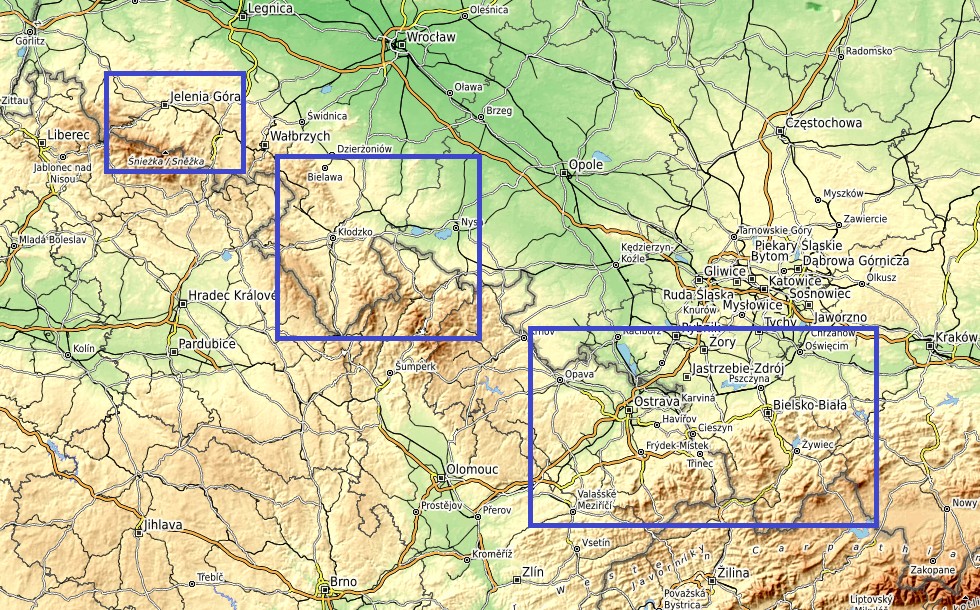 Die am schwersten betroffenen Gebiete in den Grenzregionen von Tschechien und Polen (Kartenquelle: Open Topo Map)