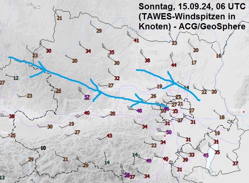 Der kräftige Westwind begünstigt aber auch den starken Stau am westlichen Alpenostrand, also von den Türnitzer Alpen bis Wienerwald. Hier wirkte zusätzlich die für den „Waldviertelexpress“ günstige Bodenkonvergenz, aber mit sehr hohen Windgeschwindigkeiten und dadurch sehr starke Hebung: