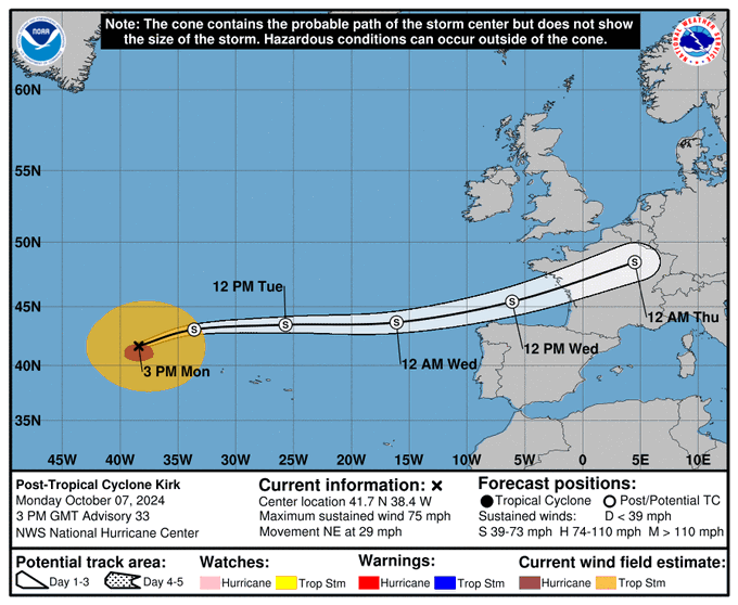 Der Hurrikan KIRK hat für Verwirrung gestiftet. Manche Medien schrieben schon herbei, dass der Hurrikan auf Europa treffen würde. Die NHC-Prognose der NOAA deutete für manche X-User an, dass der Hurrikan bis Frankreich ziehen würde. Tatsächlich bedeutet der weiße Kreis um das S, dass es sich bereits um den nicht mehr tropischen Nachfolger des Hurrikans handeln würde, also keine ausreichenden tropischen Eigenschaften aufweist, um ihn als Tropensturm zu klassifizieren.