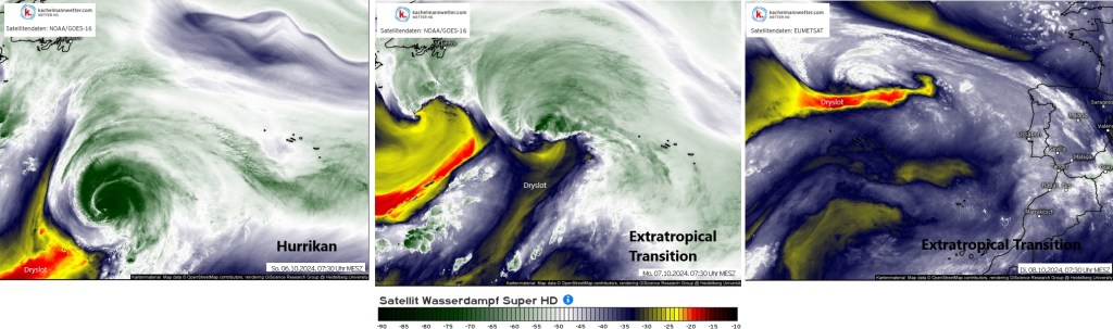 Ich tat mir mit dieser Aussage schwer, denn die Modelle rechneten bereits vor dem Landfall eine klare Umwandlung in ein außertropisches Sturmtief, speziell als Shapiro-Keyser-Zyklone, wie es sie regelmäßig in Europa gibt. Zudem wurde die Intensität von KIRK deutlich zurückgestuft.