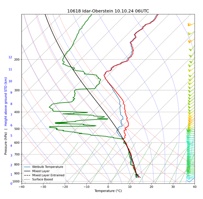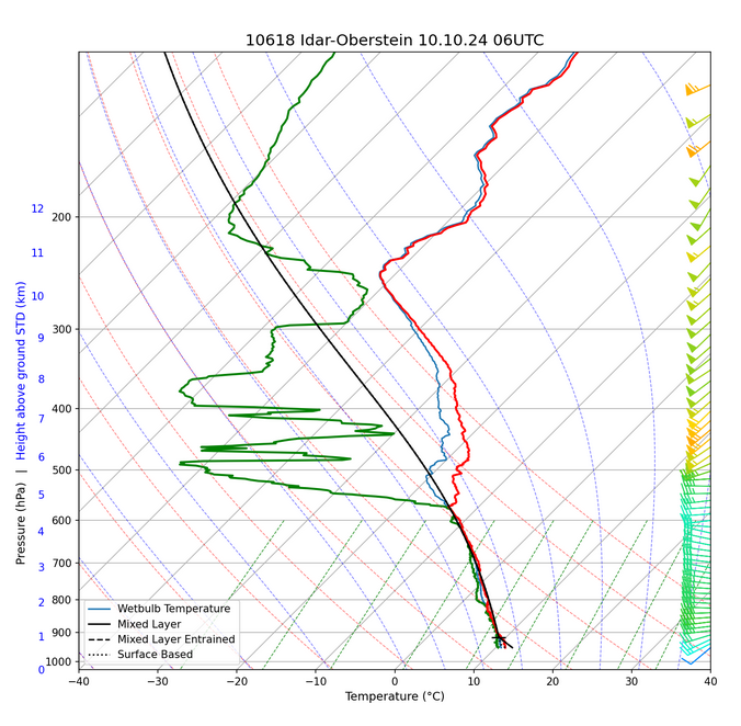 Am Donnerstagmorgen zeigt Idar-Oberstein erstmals isentropes Absinken aus der oberen Troposphäre mit starker Abtrocknung (Taupunkte unter -50°C in 500 hPa). Außerdem unterhalb der Inversion feuchtlabil bis etwa 4,5km Höhe. Die Höhenwinde hatten sich zu diesem Zeitpunkt jedoch schon deutlich abgeschwächt auf unter 40kt im Bereich der gesamten labilen (heruntermischbaren) Schicht.