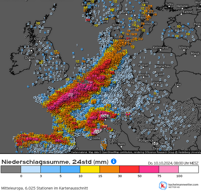 24-Stunden-Niederschlag von Mittwoch, 09.10. bis Donnerstag, 10.10., 08 Uhr MESZ (kachelmannwetter.com)
