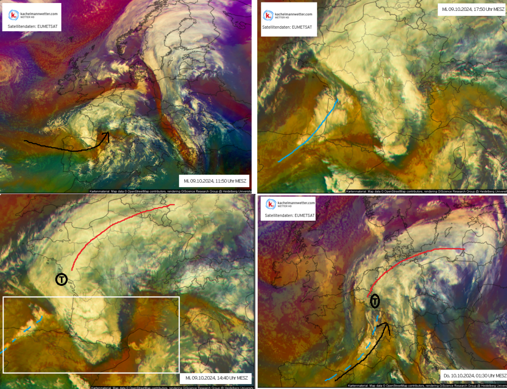 RGB-Luftmassen (kachelmannwetter.com) mit Fronten und Tiefdruckkern am Mittwoch, 09.10. 11.50 MESZ (links oben), 14.40 MESZ (links unten), 17.50 MESZ (rechts oben) und Donnerstag, 10.10., 01.30 MESZ (rechts unten)
