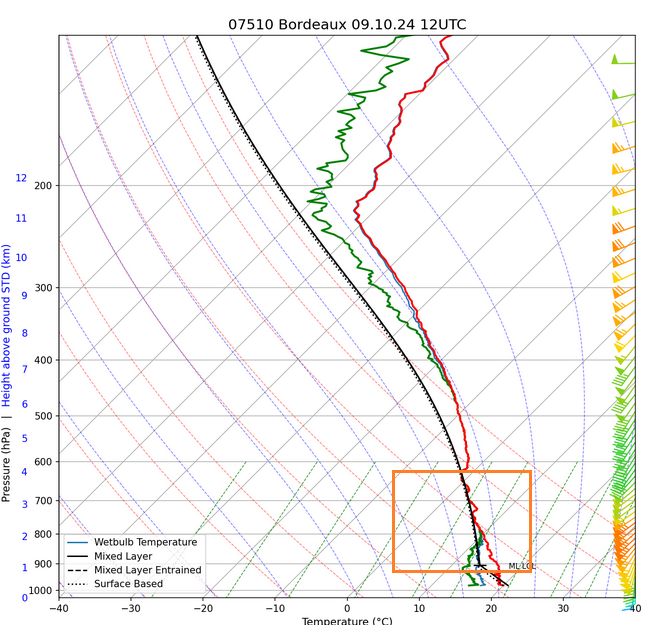 Im Aufstieg von Bordeaux ist grundsätzlich die Warmfront-Schichtung ab 600hPa erkennbar, darunter aber zwischen 900 und 800hPa eine EML und auch darüber noch eine Abnahme der Temperatur, also potentiell instabil. Die feucht-stabile Schichtung in der Höhe passt nicht wirklich gut zur Überströmungsthese.