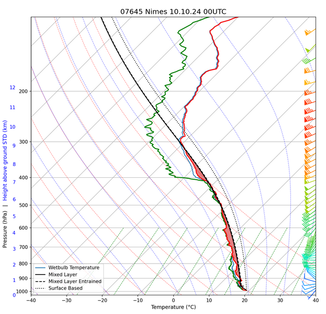 Am ehesten repräsentativ für den Kaltfrontdurchgang ist Nimes, mit hochreichend labil geschichter Luftmasse bis zur Tropopause in 9km Höhe.