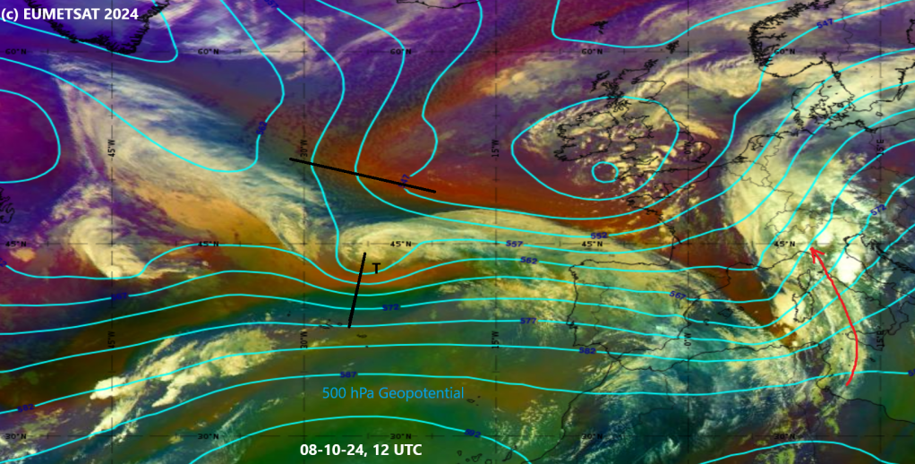 Dienstag, 08.10.24, 14 Uhr MESZ – RGB + 500 hPa Geopotential (Quelle: Eumetsat 2024)