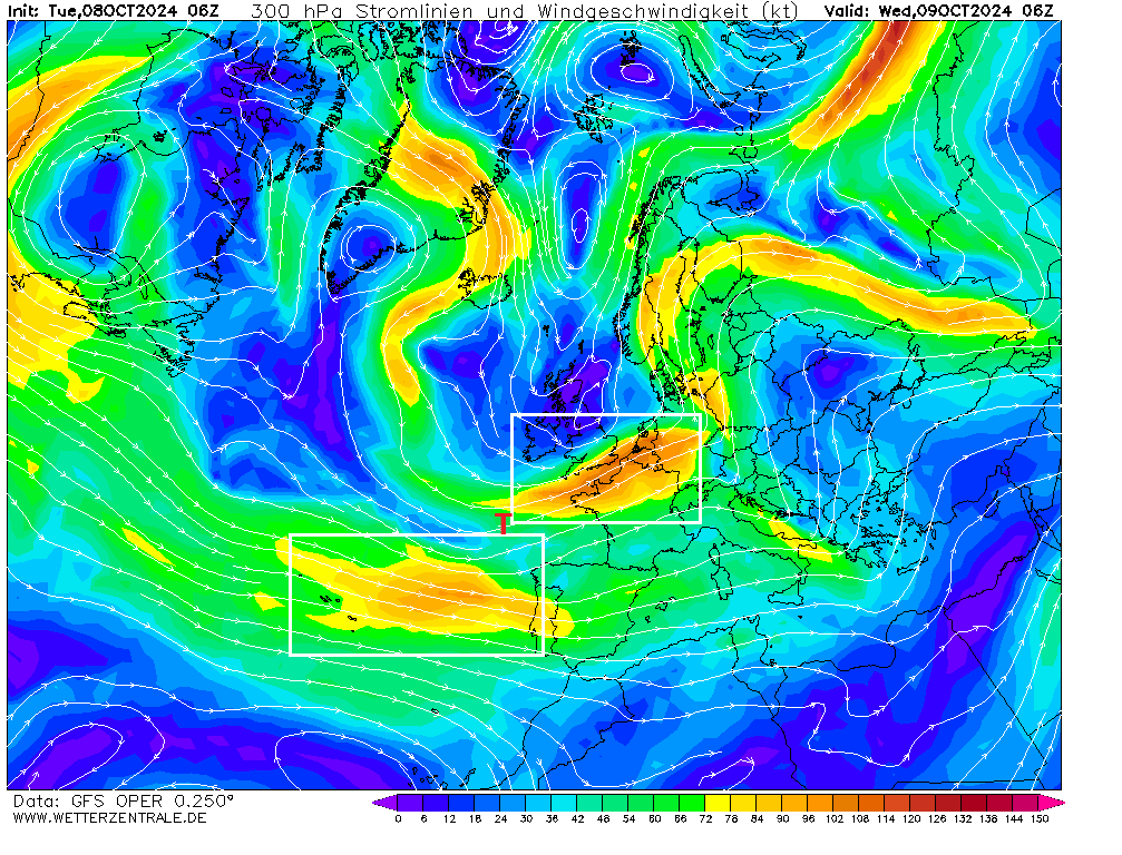 300 hPa Jetstream Prognose von GFS 06z, gültig für Mittwoch, 09.10.24, 06 UTC (wetterzentrale.de)