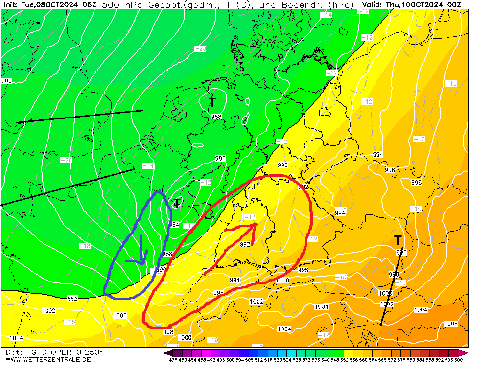 GFS 06z-Lauf, gültig für Donnerstag, 10.10.24, 00 UTC – Bodendruck, 500 hPa und Temperatur