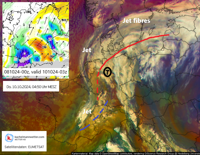 Die doppelte Jetstruktur ist bereits zu erahnen – mit dem gekrümmten Warmfront-Jet, der über die Biskaya reicht, und dem kleinräumigen Jetstreak in Verbindung mit dem Kurzwellentrog. Ex-KIRK befand sich damit im linken Jetauszug und gleichzeitig im rechten Jeteinzug – eine typische Konstellation für die Bildung von Shapiro-Keyser-Zyklonen. Sie schwächte sich allerdings mit der Ostwärtsverlagerung von Ex-KIRK ab, weshalb der Kerndruck der Zyklone annähernd gleichblieb bei der Passage von Mitteleuropa.