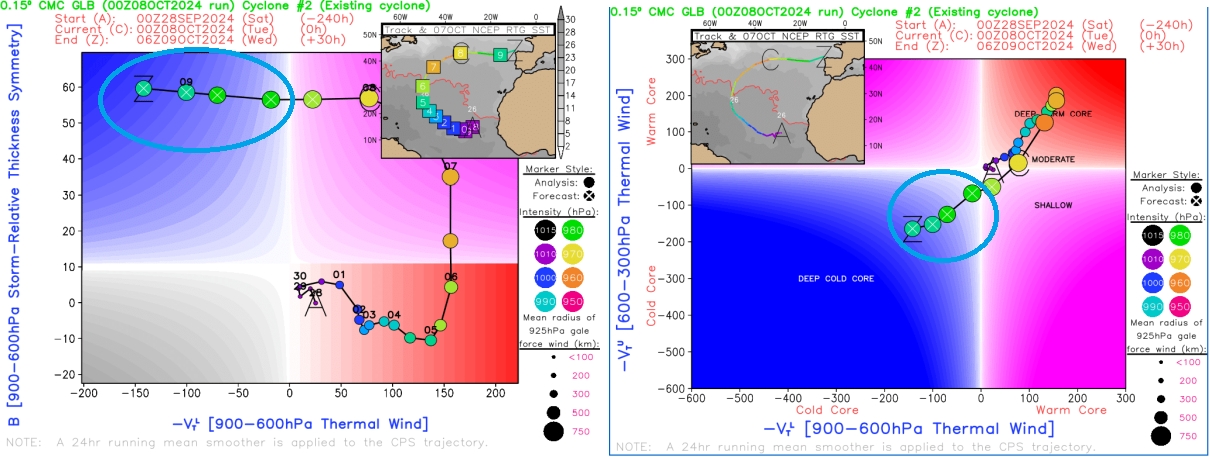 Laut Phasendiagrammen ist die Umwandlung von KIRK zu einem außertropischen Sturmtief schon vor Spanien abgeschlossen, es würde sich dann um ein Tief mit assymetrischem, hochreichend kalten Kern handeln – also das Gegenteil eines Hurrikans.