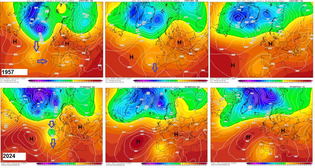 In 1957 the cut-off process started far west near the Azores islands, then slowly drifting eastward, with a surface low (no classic cold air drop). The broad upper-level low then moved southward. At the peak of the event, a significant easterly flow was present but rather weak upper-level flow which could explain the comparatively low rain amounts (no sustained deep-moist convection). However, a strong surface low has been present a fews days before in the area, and the foregoing precipitation event may have strengthened the degree of flooding.