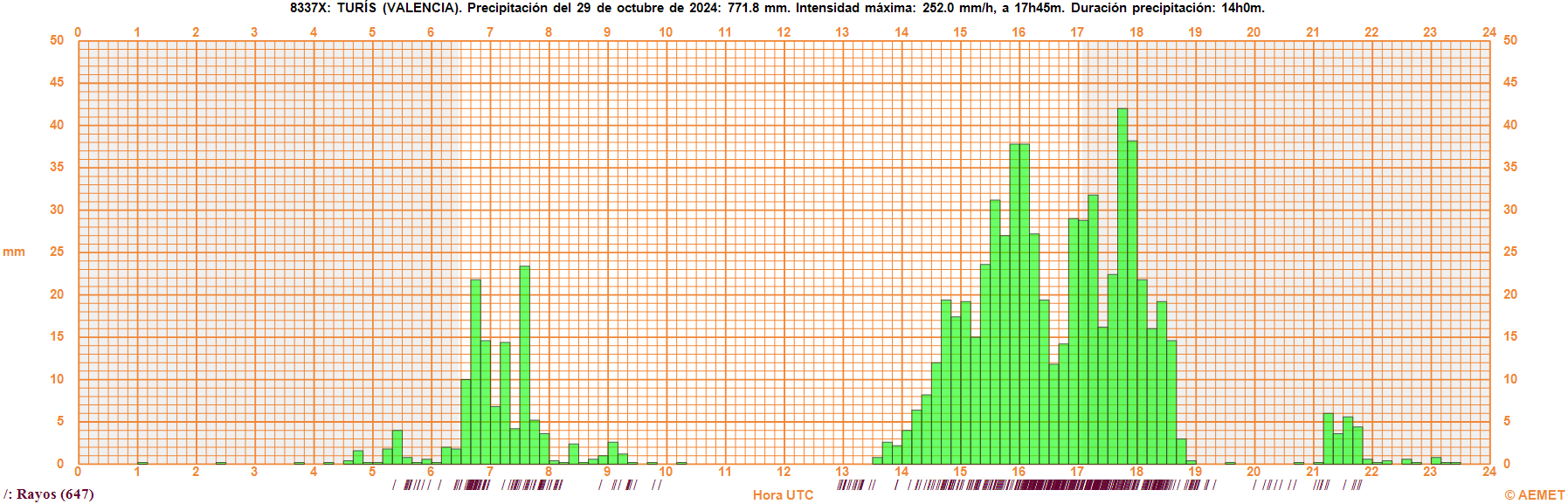 - Chiva, W of Valencia: 491,2mm in 24 hrs, 343mm in 4 hrs (16.30-20.30), 160mm in 1 hr.
