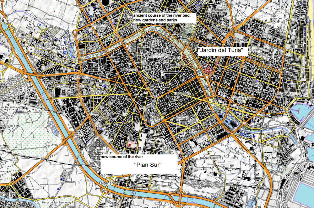 As a consequence, the river has been regulated and deviated from its original course through an artificial river bed, starting in 1958 and being finished in 1973. Planners thought the city would grow north and west the after rerouting but most new city parts developed south of the new Turia course. The river channeling also enhanced the risk of a faster flow and higher water levels downstream, with greater risk of flooding.
