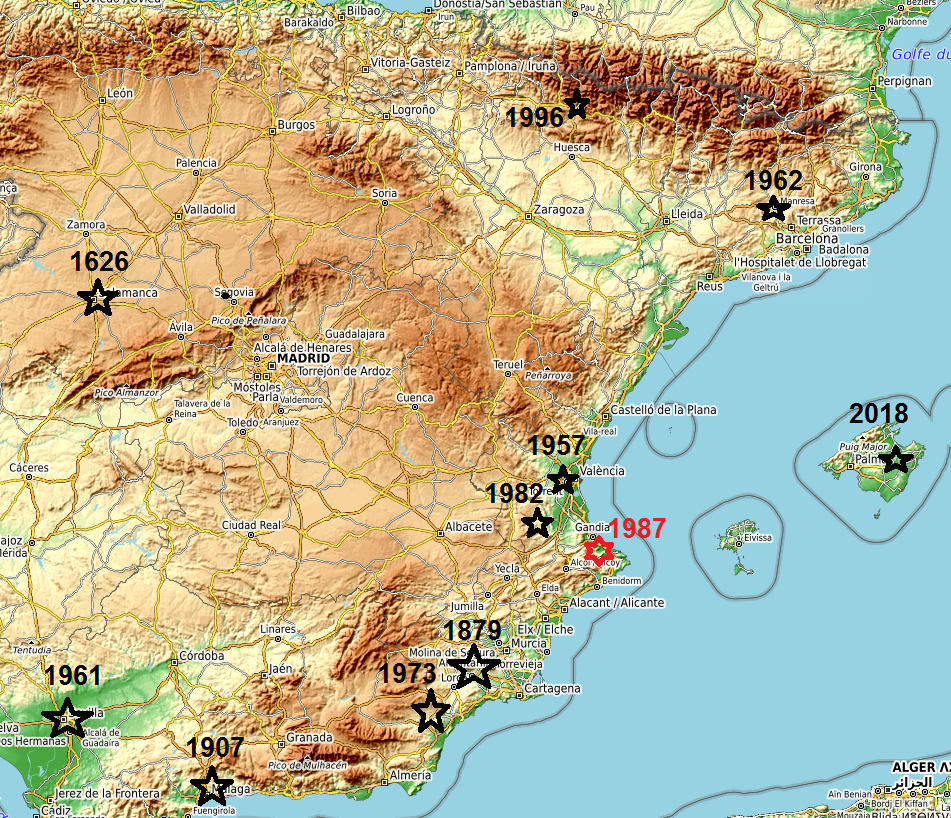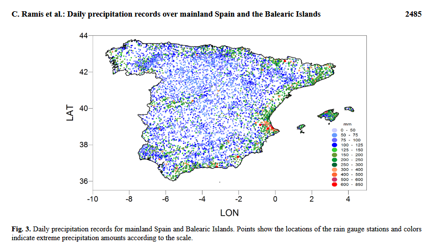 The Mediterranean region has always been in the focus of severe rain events in autumn when the first spell of cold upper-level air extends over the still heated sea, causing large instability and severe thunderstorms. It’s called dana in Spain, for depresión aislada en niveles altos (very detailed description here). Given a favourable easterly flow, the combination of strong deep moist convection and upstream flow alongside the coastal mountain range is able to raise the river levels in a short time. Current all-time record for 24 hr precipitation is 817mm in Oliva, Valencia on 3th November 1987.