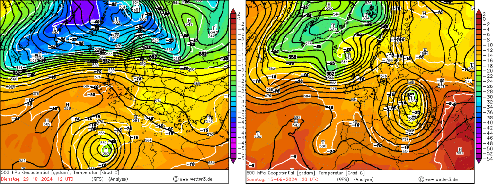 In both historic flood events, the upper-level low has been exceptionally large and strong, indicating maximized warm air advection and dynamic forcing (pva maxima). The event in September affecting Eastern Austria, Czechia and Poland drew very moist and unstable air masses from the Black Sea while the Spain event had warm and quite unstable air mass with origin from North Africa.