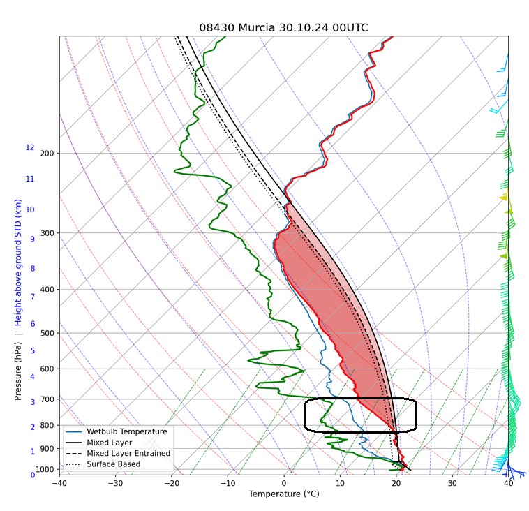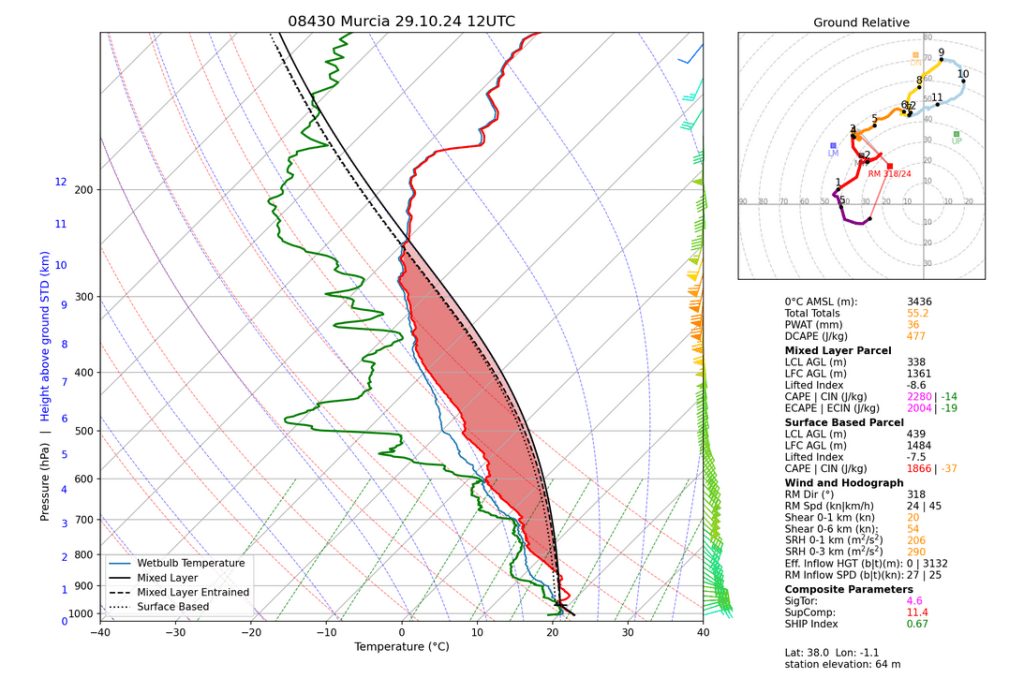 The Murcia sounding reveals big CAPE and very low LCLs, strong low-level and deep-layer shear with significant index values for significant tornadoes and supercell storms. Moreover, strong low-level easterlies enhancing orographic precipitation.