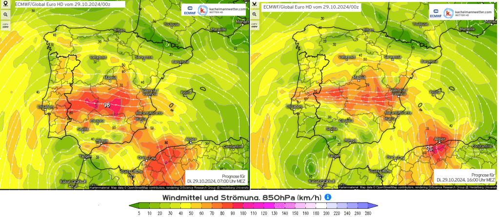 In 2024, the cut-off process took place further east over UK, then moving southward towards the Iberian Peninsula. In general, the upper-level ridges were more pronounced with higher geopotential heights than in 1957. They also lied above the 850mb mean temperature (1991-2020), i.e., well above the 1961-1990 mean. The upper-level-low has been much deeper than in 1957 and the upper-level flow on the front side has also been much stronger. At the peak of the event, a small-scale surface low developed south of Valencia, enhancing low-level flow and convergence as well as orographic precipitation in the area of interest.