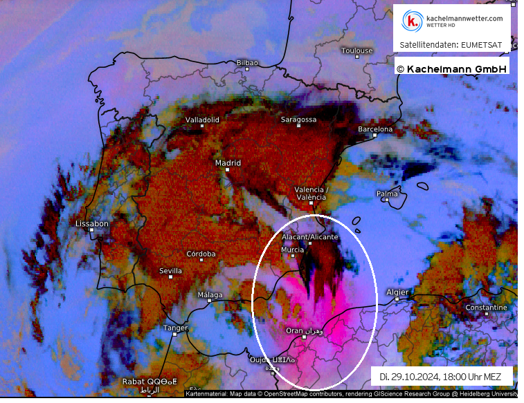 Like in 1957, the flashflood event came in two waves. The first wave struck the area in the morning of 29th October between 04 and 08.30 UTC, with a nearly stationary multicell cluster. The second wave started around 12.30 UTC, initally affecting the drainage area west and southwest of Valencia. The peak convergence occurred between 13.45 and 18.45 UTC with main cloud tops well below -60°C, locally up to -70°C. Several and strong tornadoes happened at the same time south of Valencia, indicating the strength of the low-level convergence there.