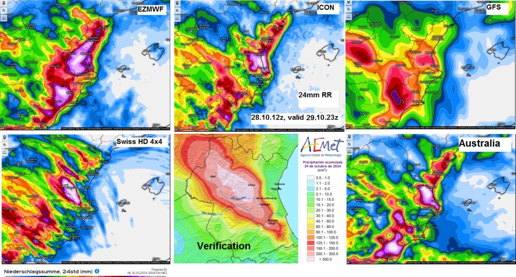 About 12 hours before the event, Swiss HD (Cosmo?) had the best performance with location and degree of precipitation (locally up to 200mm). ECMWF wasn’t bad either and even the australian model showed the peaking amounts at the right place. ICON had it too close to the coastal area and GFS was a nothingburger.