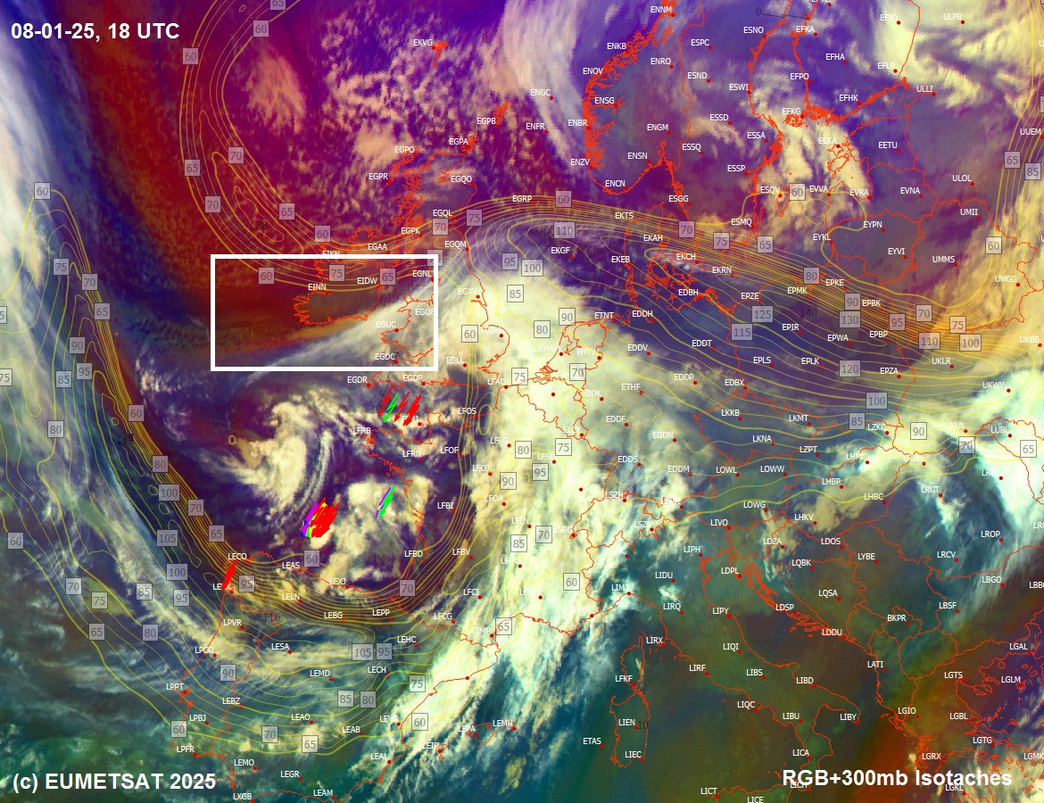 Sturmtief CHARLY entstand am Mittwoch, 08. Jänner 2025 am Okklusionspunkt eines mehrteiligen Atlantiktiefdrucksystems und zog als Wellentief langsam nordostwärts. Mit der Annäherung eines markanten Höhentrogs von Norden wurde die barokline Zone reaktiviert und Frontogenese setzte ein. Die Kaltfront geriet in weiterer Folge in die doppelte Jetkonfiguration mit nachrückendem Warmfrontjet (left exit region) und Polarfrontjet (right entrance region). Das begünstigte die Entwicklung eingelagerter Gewitter an der Kaltfront mit lokal schweren Sturmböen. Die umgebogene Okklusion wurde vollständig vom Dryslot überrannt, die frontrückseitige Trogaktivität setzte verzögert ein, bis die Grundschicht wieder soweit angefeuchtet wurde, dass Feuchtkonvektion möglich war (mit einem weiteren Randtrog über der Nordsee in der Nacht auf Freitag).