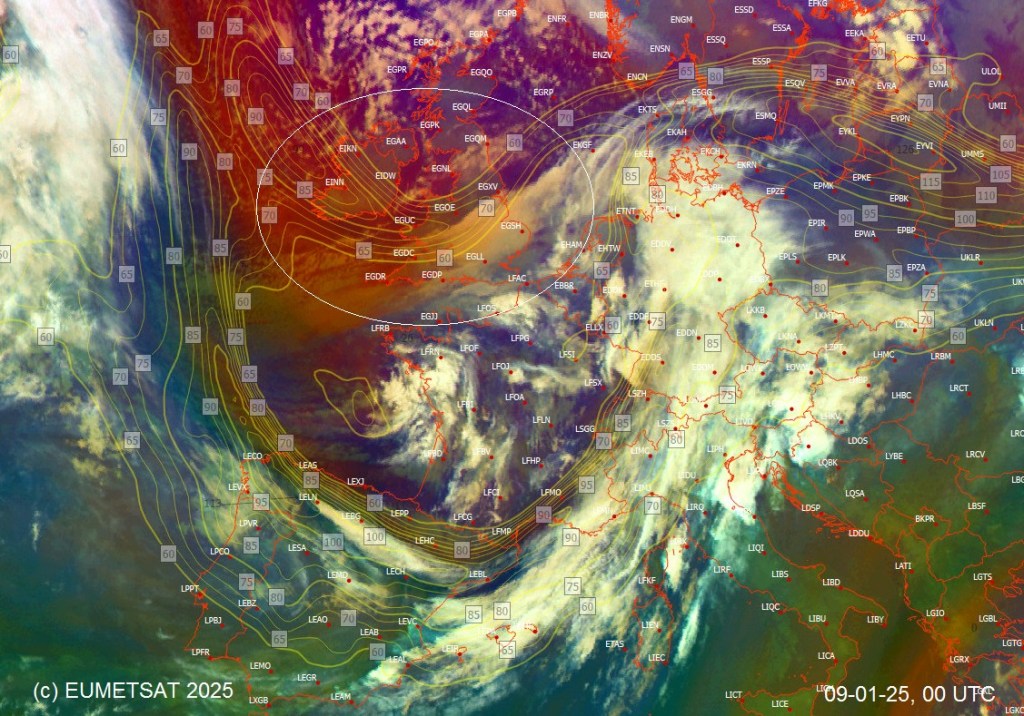 Das Sturmtief entstand auf der kalten Seite des Jetstreams rückseitig der Okklusionsfront eines ausgedehnten Tiefdrucksystems über dem Ärmelkanal.