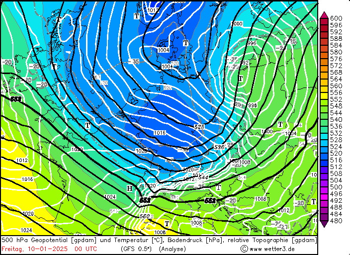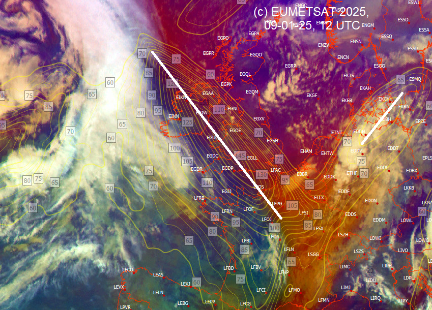 Am Donnerstag, 09. Jänner 2025 entwickelte sich über Frankreich und Benelux ein kleinräumiges, aber intensives Sturmtief, das in der Nacht auf Freitag, 10. Jänner, mit einer gewittrigen Kaltfront durchzog. Am Abend erfasste das Sturmfeld auch den Nordalpenraum, wo verbreitet Monats- und sogar Allzeitrekorde gefallen sind. Der synoptische Ablauf verdient natürlich eine genauere Betrachtung. Das Titelbild suggeriert bereits markante Dynamik mit einem sehr steilen Trog, der left-exit region über Österreich, der gerippten Kaltfrontstruktur mit eingebetteten Gewittern und deutlich gesunkenenen Wolkenobergrenzen der Okklusionsfront durch die Überströmung mit der Stratosphärenluft. Dazu kam noch ein starker frontrückseitiger Druckanstieg und Temperatursturz.