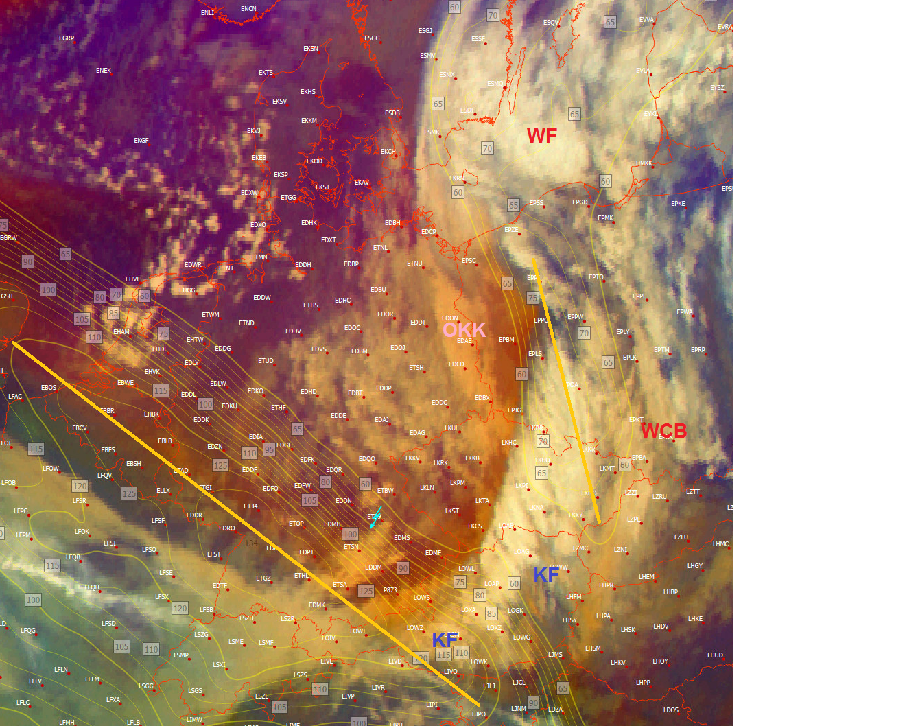Das IPV-Maximum zeigt sich im Wasserdampfbild durch das „schwarze Loch“, welches sehr trockene Luft (unter 10% relative Feuchte) in der Höhe andeutet. Selten ist es allerdings so tiefschwarz wie die Nacht. Das Zentrum der Schwärze ist auf den aktivsten Teil der Kaltfront gerichtet. Die konzeptionellen Modelle passen also.
