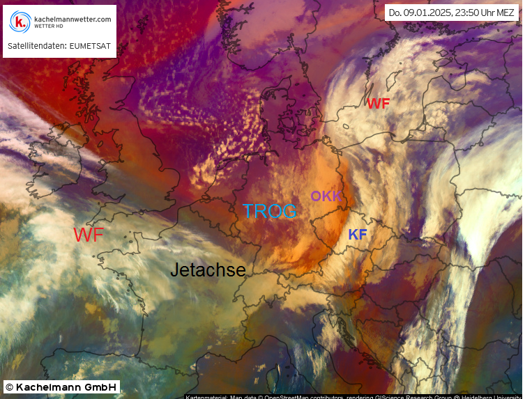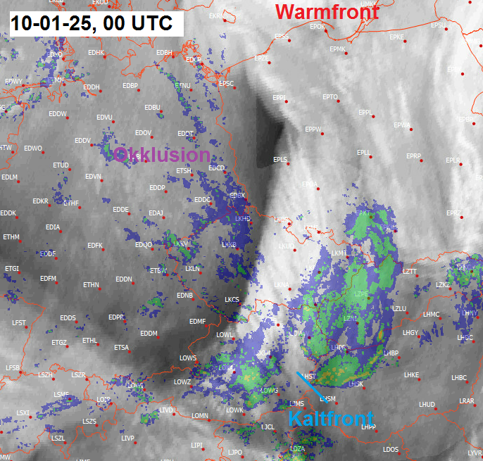 Im Wasserdampfbild schwächte sich das IPV-Maximum ebenfalls ab. Die Kaltfront hatte um Mitternacht keine lineare Struktur mehr. Die umgebogene Okklusion sorgte für schwache Niederschläge über Ostdeutschland bis Tschechien.