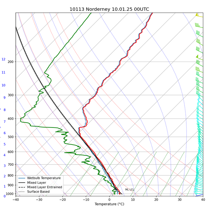 Repräsentativ für die Kaltluft-CBs ist der Mitternachtsaufstieg von Norderney , hochreichend feucht-labil bis zur Tropopause in 6km Höhe.