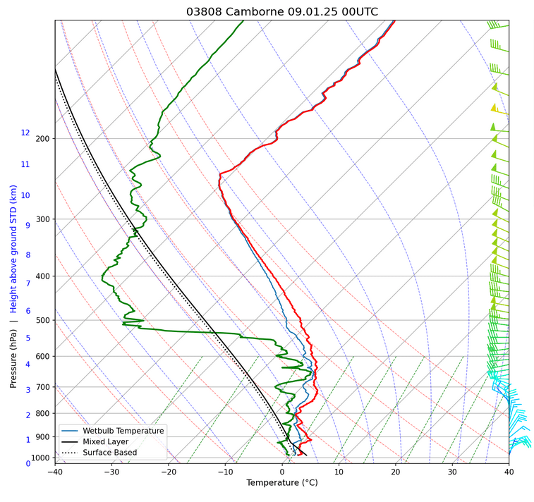 Der zugehörige Aufstieg, allerdings schon auf der kalten Seite der Welle zeigt die feuchte Schicht bis etwa 4000m hinauf. Darüber das stratosphärische Absinken mit sehr trockener Luft (Taupunkte unter -60°C). Die Luftmassengrenze intensivierte sich bereits, mit 5-7°C über dem Ärmelkanal und -2 bis -5°C über Wales und dem Norden von England sowie Irland.