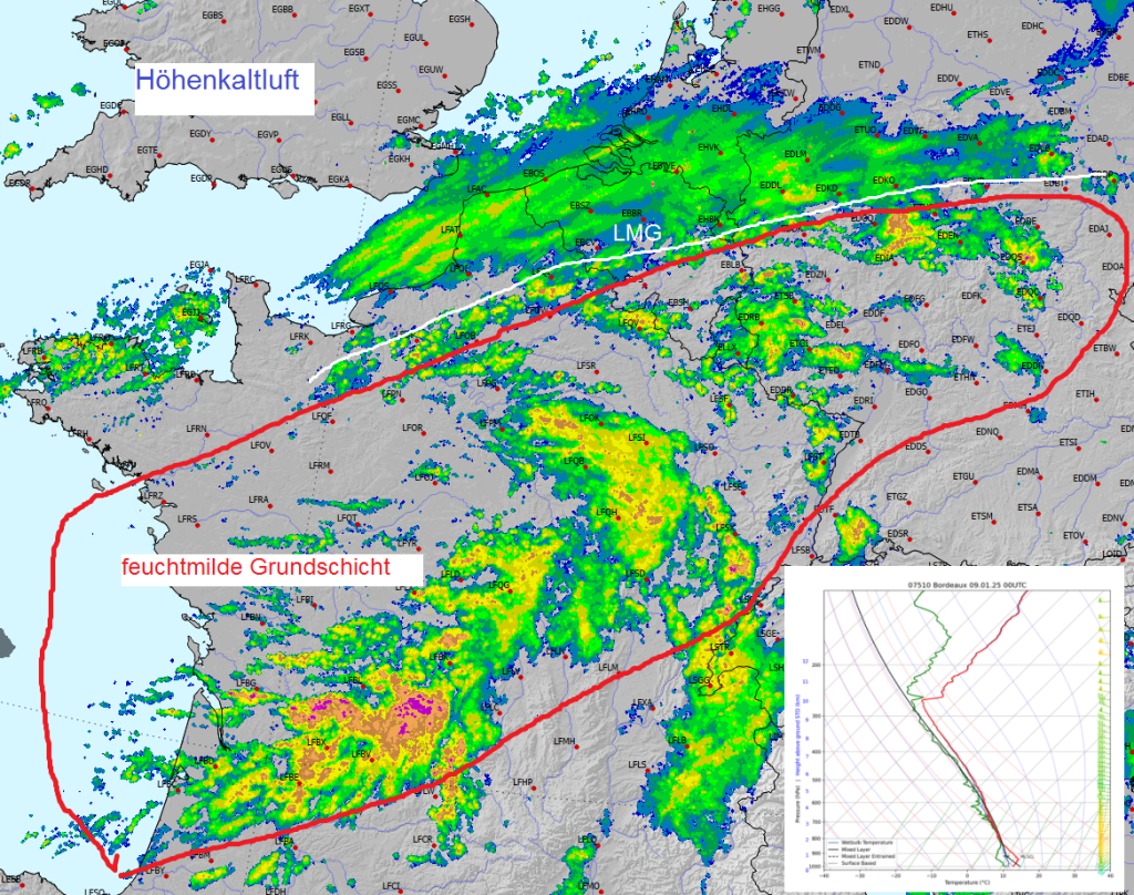 Das Radarbild um diese Uhrzeit ist tricky, denn dort, wo die Höhenkaltluft vorhanden war, gab es keinen Niederschlag. Auf der kalten Seite der Luftmassengrenze hingegen stratiformen Niederschlag und im Warmsektor reichlich Bewölkung mit ausgedehnten, konvektiv durchsetzten Radarechos. Der Mitternachtsaufstieg von Bordeaux ist einigermaßen repräsentativ für diese süffige Luftmasse und hochreichend labil. Die Obergrenzentemperatur der konvektiven Echos lag bei -55 bis -60°C, also Tropopausenhöhe in ca. 10km.