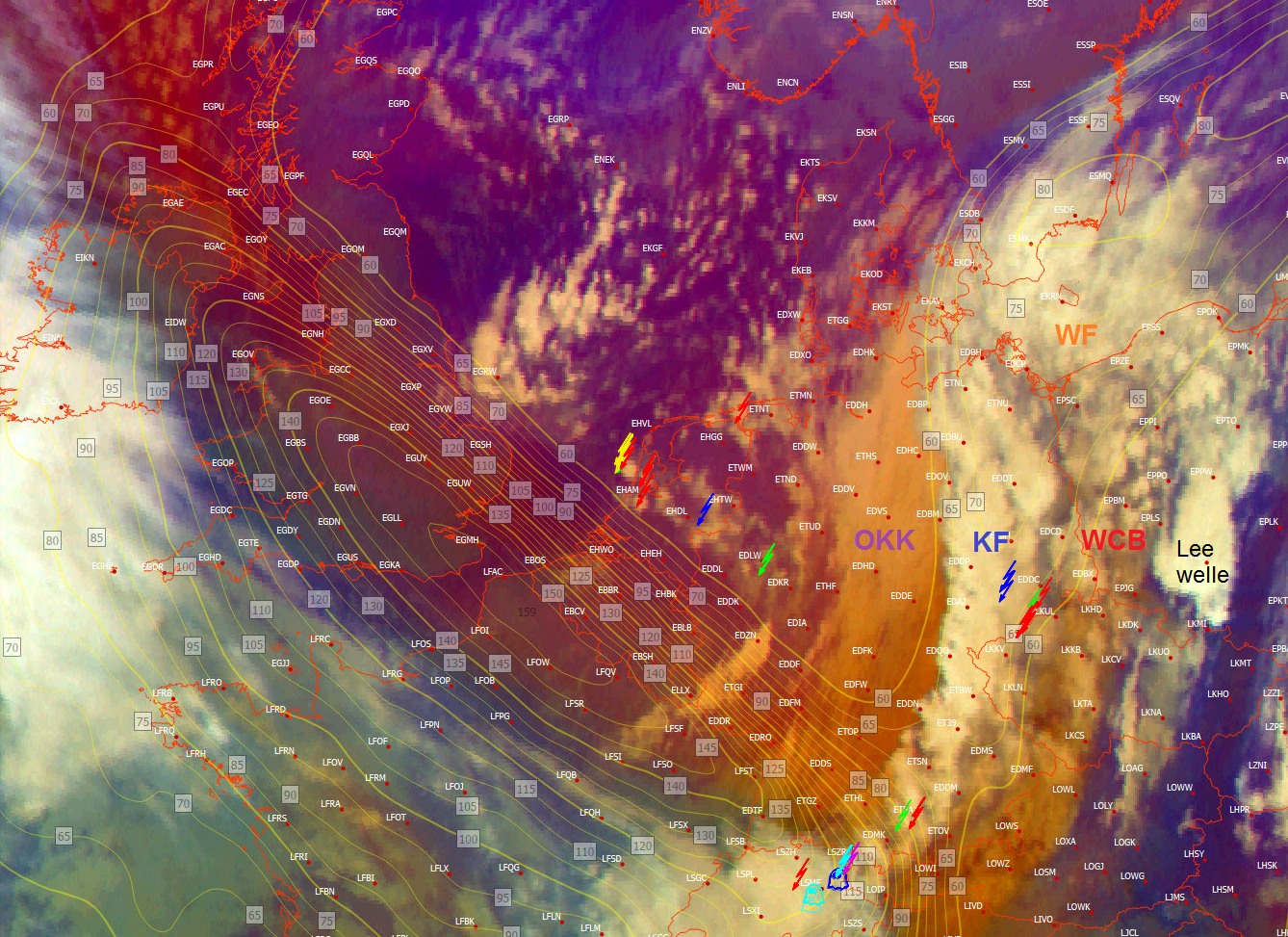 Interessante Konstellation der verschiedenen Bänder und Fronten um 19 Uhr Lokalzeit. Der Polarfrontjet ist weiterhin scharf gekrümmt, der Südrand der Kaltfront in der left-exit-region des Warmfrontjets. Entsprechend gibt es in beiden Hebungszonen des Jets Gewitter. Präfrontal sorgt das warme Förderband (WCB) für leichte Niederschläge und feuchtet die Grundschicht an – das könnte die Windspitzen im Flachland abseits orographischer Effekte abgeschwächt haben. Die kräftige Südströmung sorgte im Lee des Sudetengebirges für eine ausgeprägte Gebirgswelle (Mountain Wave). Unmittelbar westlich der Kaltfront schließt die umgebogene Okklusion an, die nahezu vollständig im Dryslot verschwunden ist. Erst dahinter wird die Luft etwas angefeuchtet und von der Nordsee her greifen Kaltluft-Gewitter über.