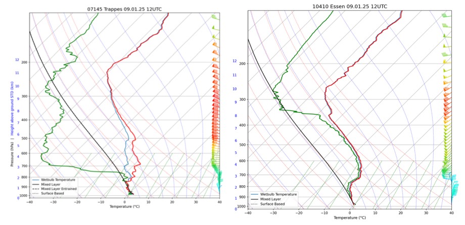 Die beiden Aufstiege zeigen die Situation postfrontal (Trappes) und im Bereich der Okklusionsfront (Essen). Sehr tiefe Taupunkte postfrontal bis 750hPa herab. Daher keine hochreichende Feuchtkonvektion rückseitig der Kaltfront. In Essen hochreichend feucht und ab 700hPa der Warmluftbauch der Okklusion. Darunter Kaltluftadvektion aus Nordost und entsprechend Schneefall.